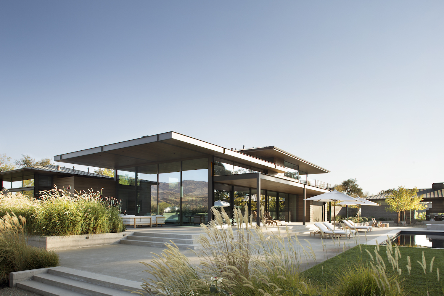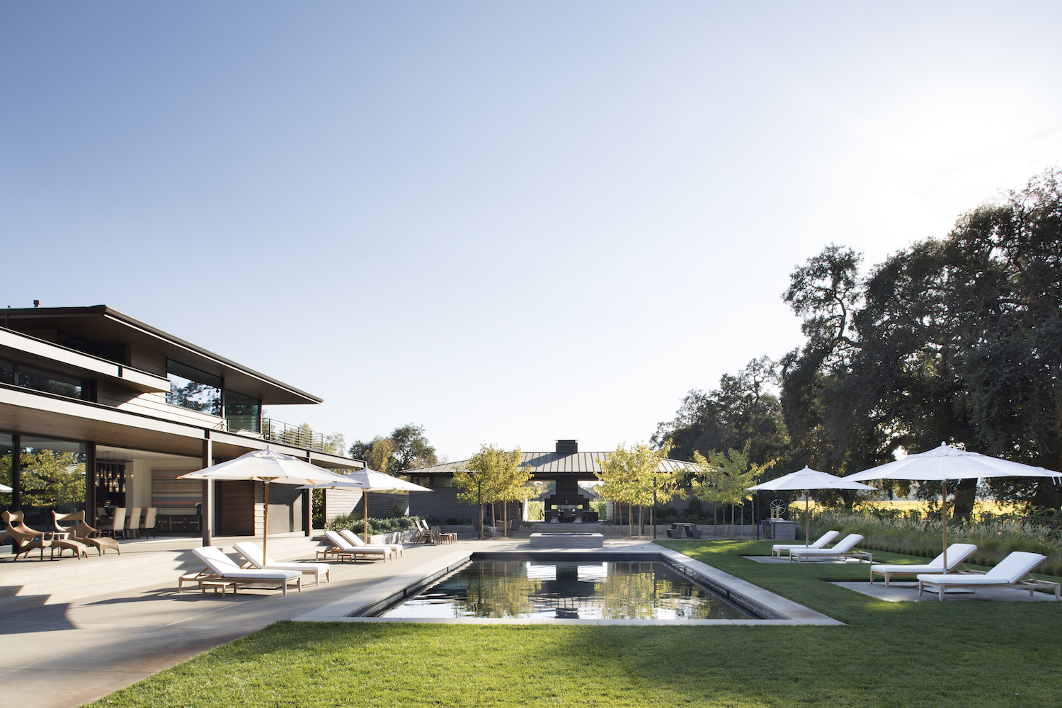 Situated on the valley floor and boasting uninterrupted views of Napa’s iconic Stags Leap Peak, Big Ranch Getaway was designed and built to highlight and enhance its picturesque surroundings. Floor to ceiling glass panels bring the beauty and splendor of the scenery in. Cedar siding throughout the exterior lends warmth to the more contemporary board form concrete, steel, and glass of the core structure. With three bedrooms in the main residence, two detached guest suites, a lovely pool area, and an open floor plan featuring sliding glass panels for indoor/outdoor living, Big Ranch Getaway is the ultimate estate for entertaining.