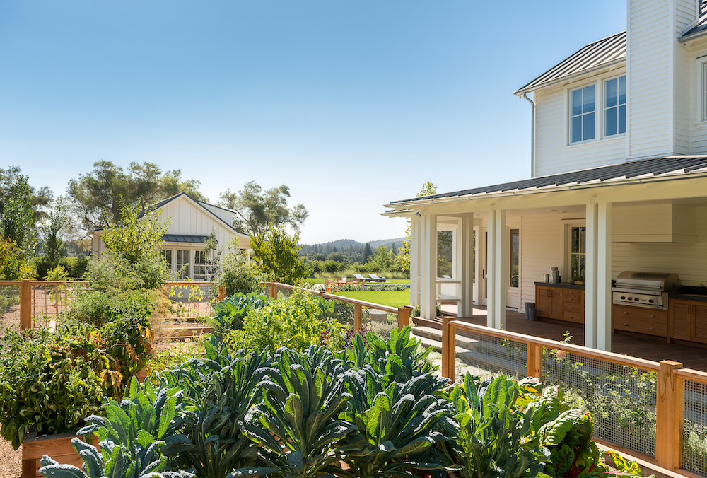 A corner lot with sweeping views across vineyards to the south and west hills, this breathtaking farmhouse-style property was built for a local St. Helena family. The estate includes a main house with extensive surrounding landscape and gardens, as well as a large pool with a guest house, and detached garage building. A sleek concrete fireplace serves as a cozy meeting place for family comings and goings in the warmer months, while a great room separating the kid’s quarters from the master suite serves the same purpose in the winter.